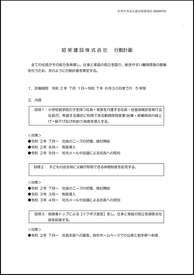 令和2年7月18日に経営トップから全社員に向けて「次世代育成支援対策推進法」に基づく一般事業主行動計画の宣言をいたしました。